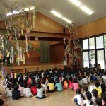 7月5日(金)、ホールで七夕集会を行いました。子どもたちは、七夕の由来や各学年で作った笹飾りの紹介を聞いた後、歌「たなばた」を歌い、最後に、大型紙芝居「へんしんトンネル」を観て、楽しい時間を過ごしました。