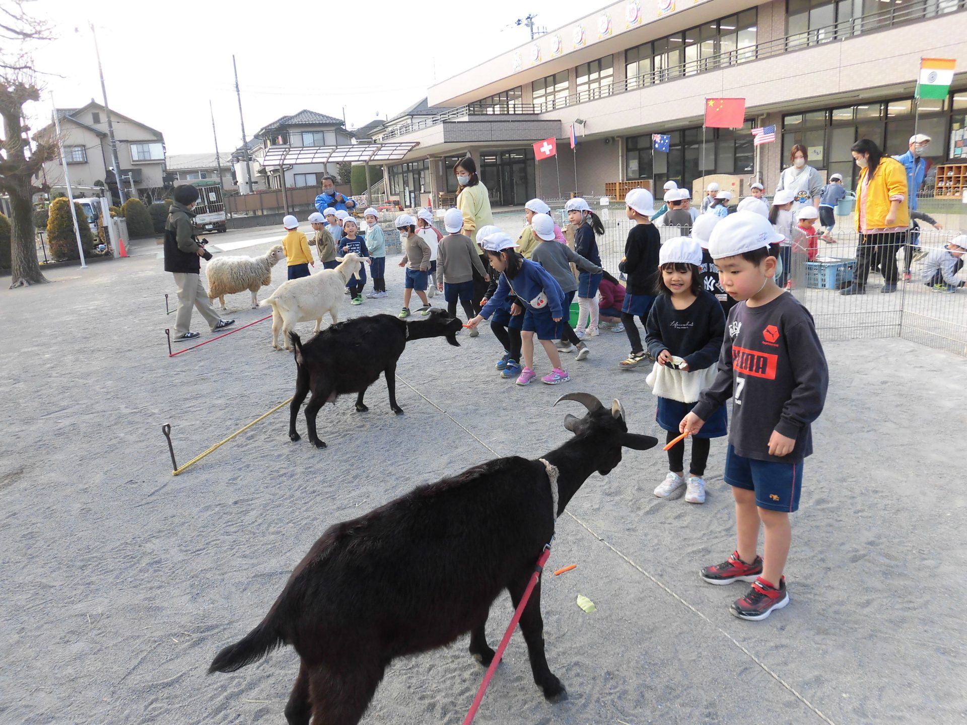 1月18日(木)、「どうぶつむら」から、動物(ポニー、ヒツジ、ヤギ、うさぎ、モルモット、ネズミ、インコ、シマリスなど)が来て、園庭で子どもたちが餌をあげたり、触れたりして、楽しい時間を過ごしました。