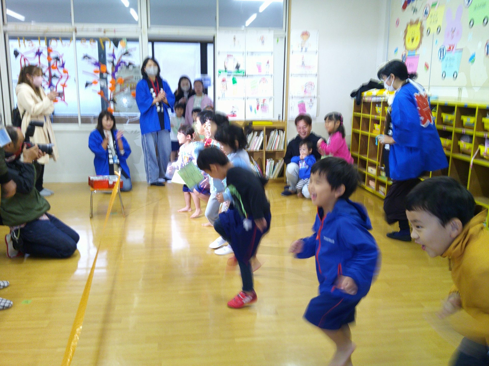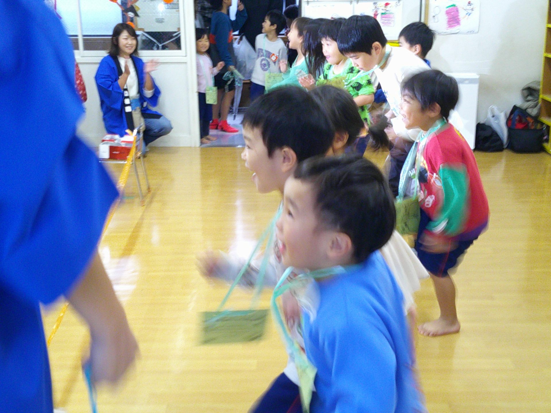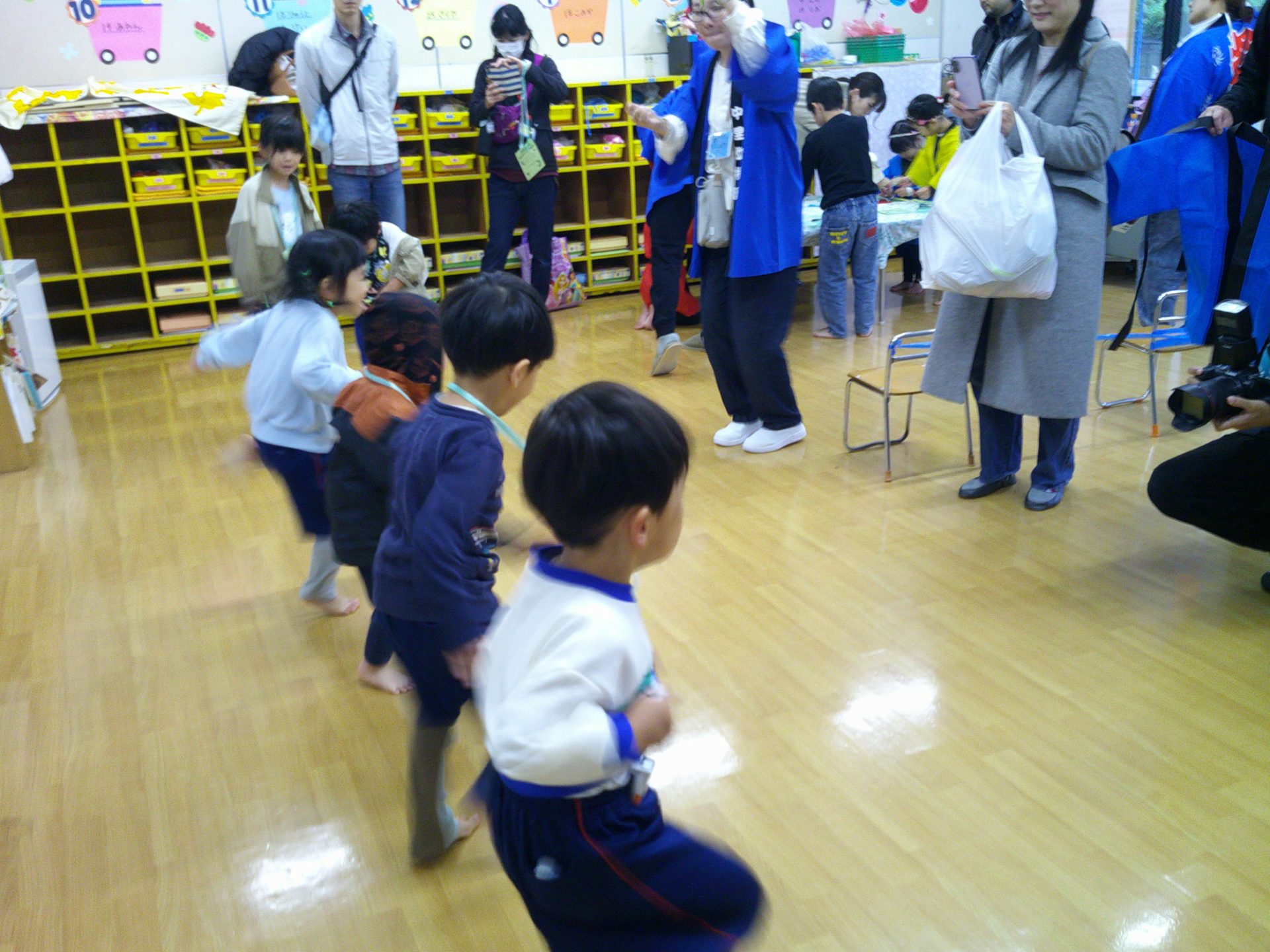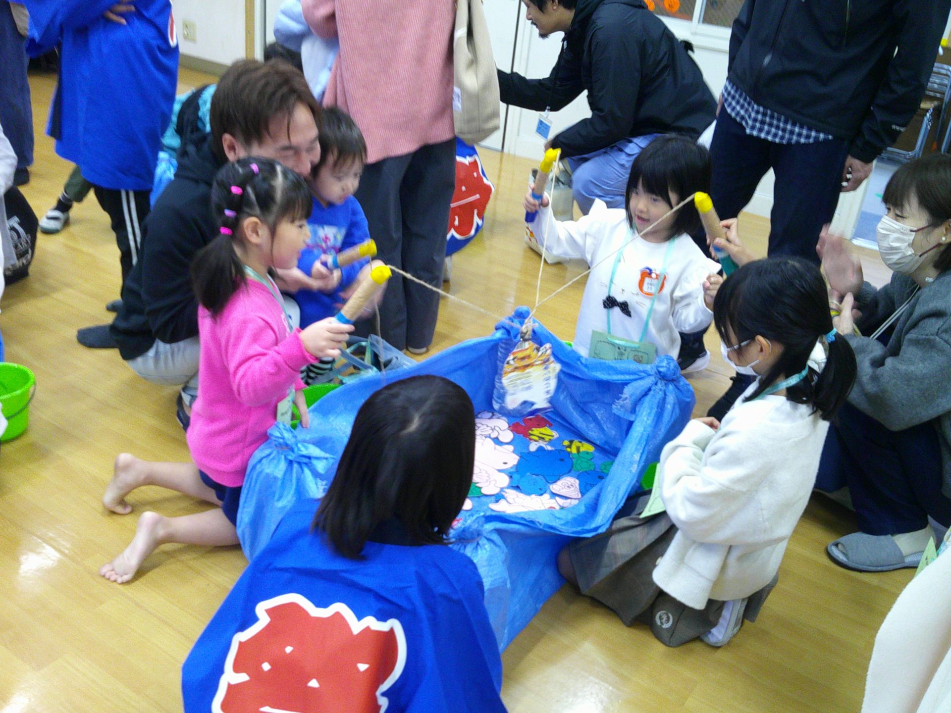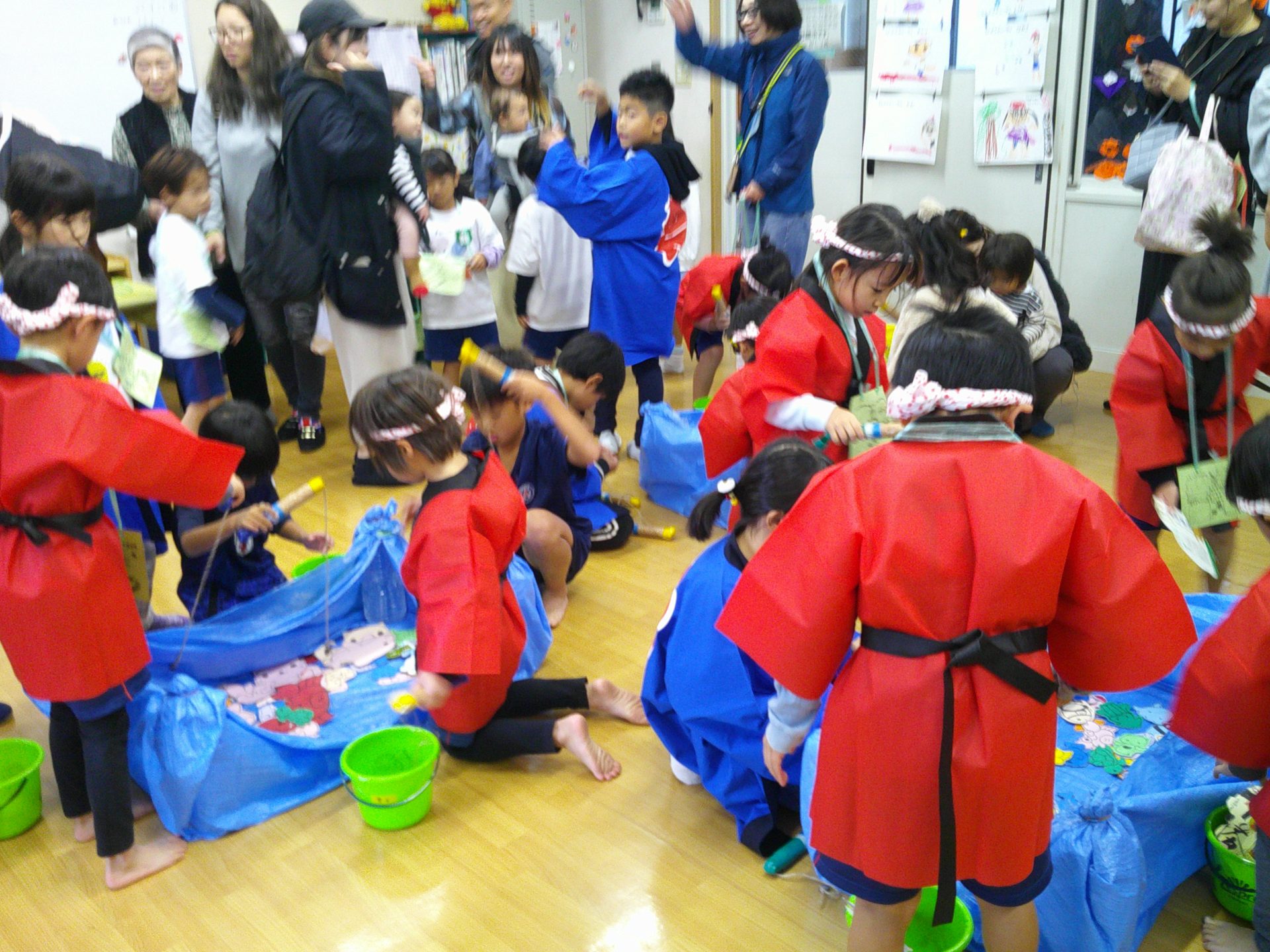 10月25日(土)、¨なかざとまつり¨を行いました。雨天のため、園舎内で親と一緒にスタンプラリー(ふりふりダッシュ、お魚つれるかな、つみつみボックス)を楽しみました。なお、29日(水)に、おみこし(年中・年長)を担いだり、山車(年少)を曳いたりします。