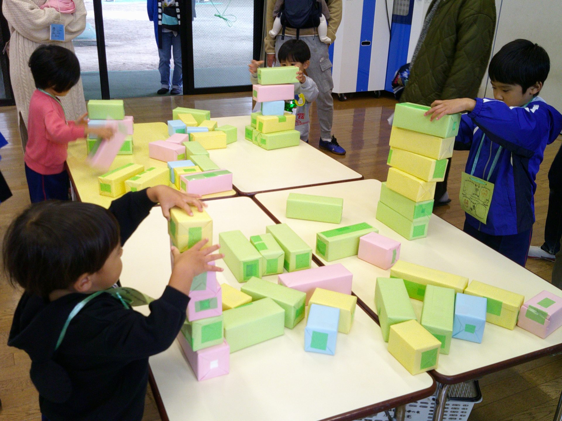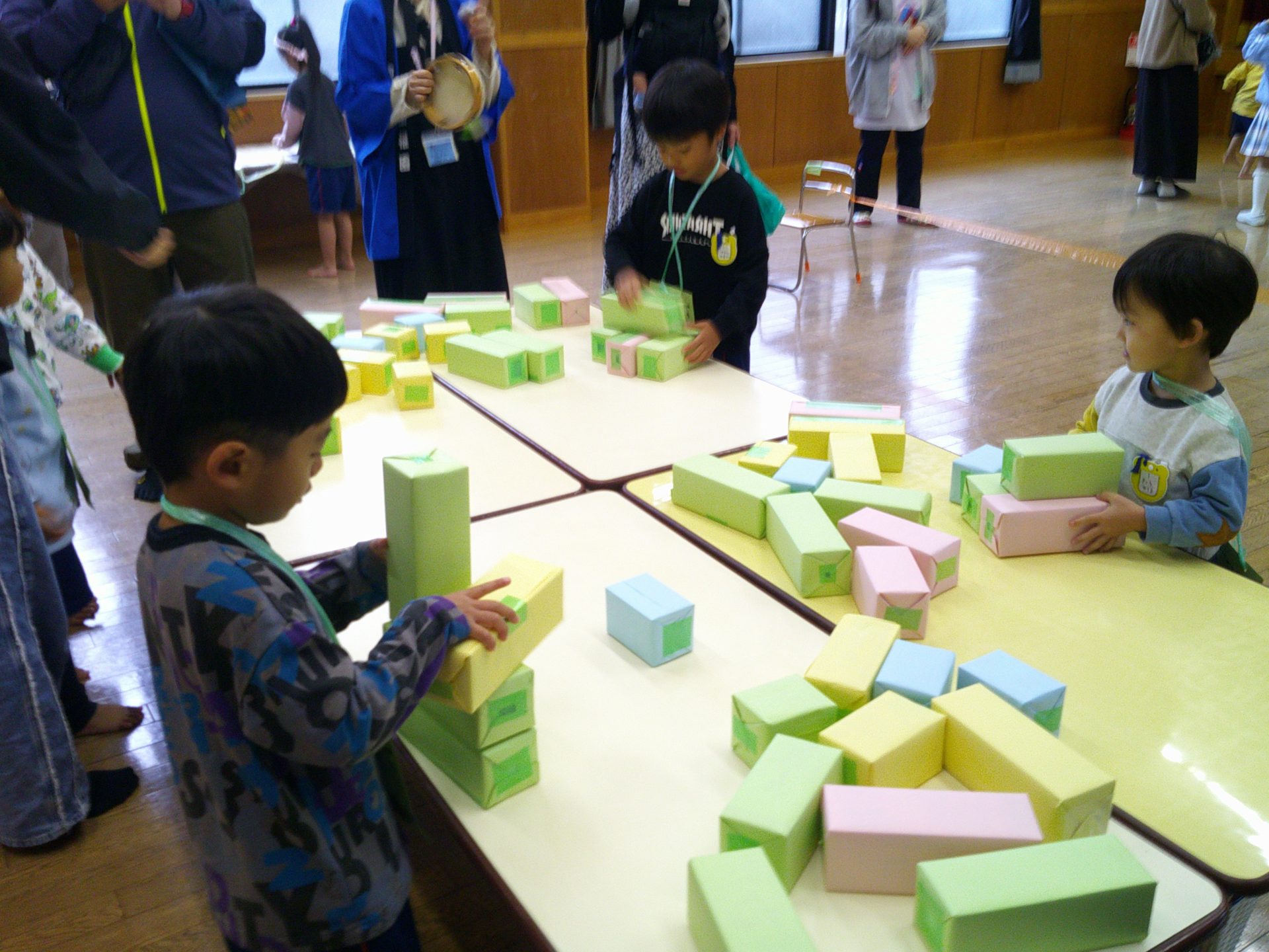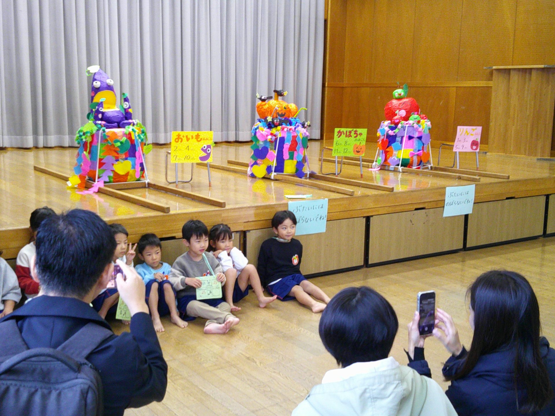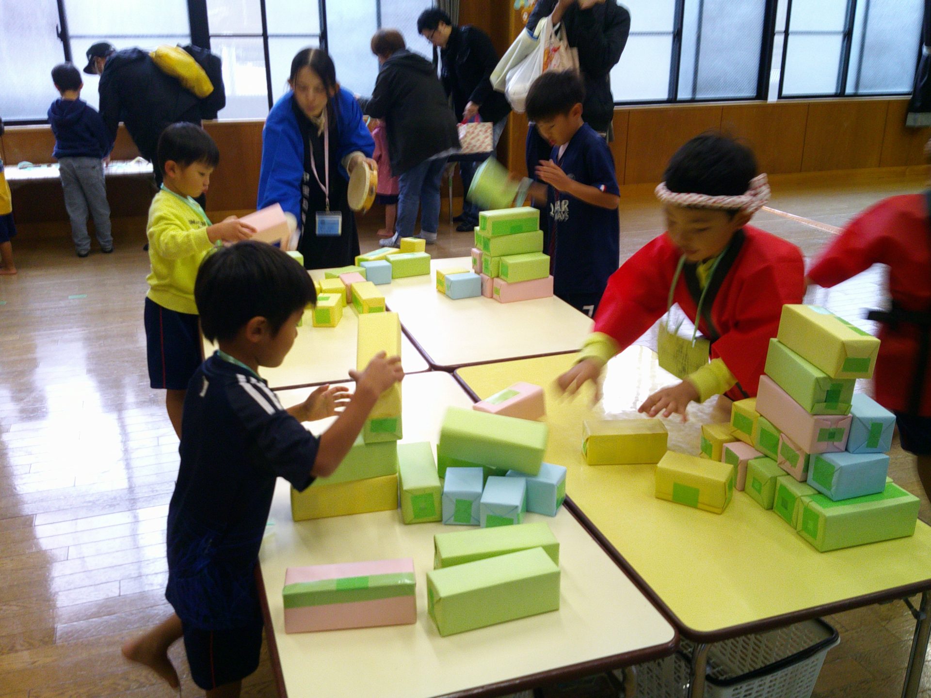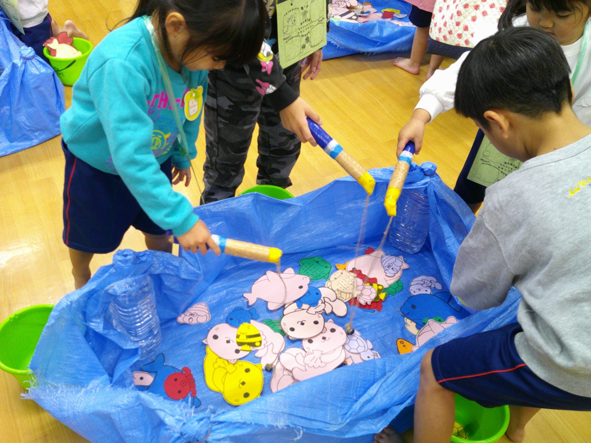 10月25日(土)、¨なかざとまつり¨を行いました。雨天のため、園舎内で親と一緒にスタンプラリー(ふりふりダッシュ、お魚つれるかな、つみつみボックス)を楽しみました。なお、29日(水)に、おみこし(年中・年長)を担いだり、山車(年少)を曳いたりします。
