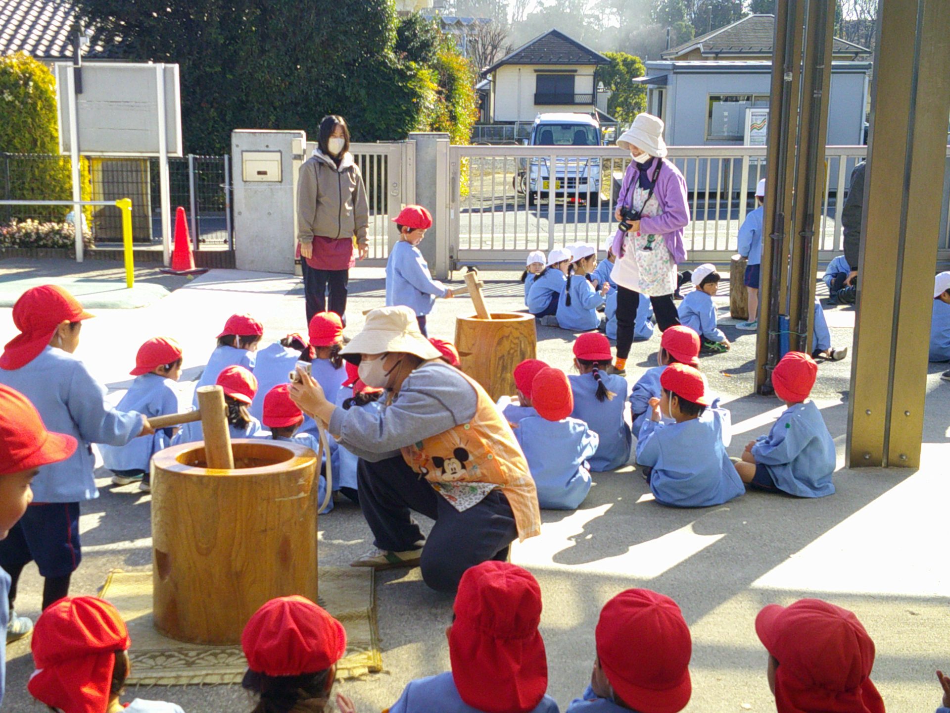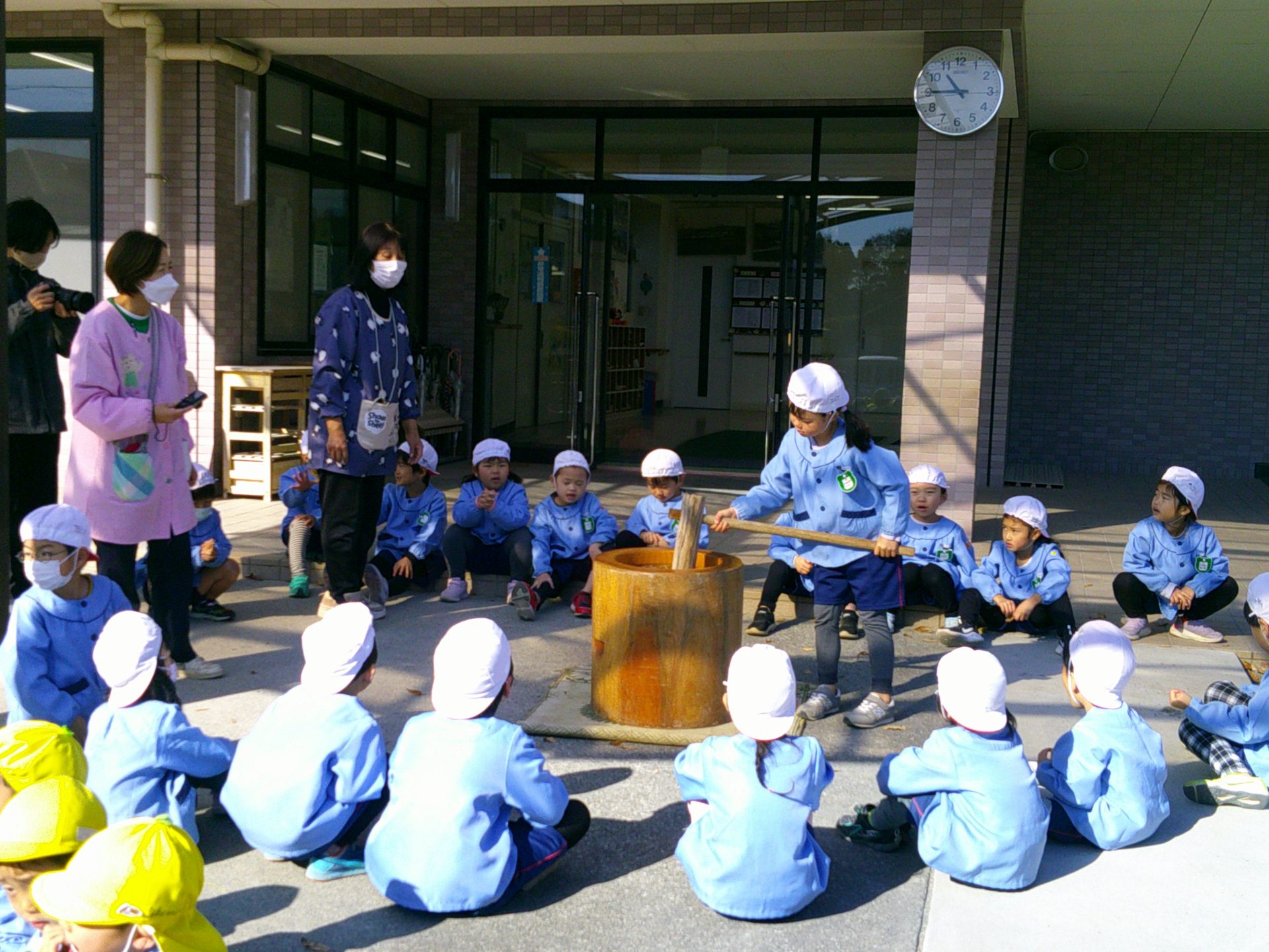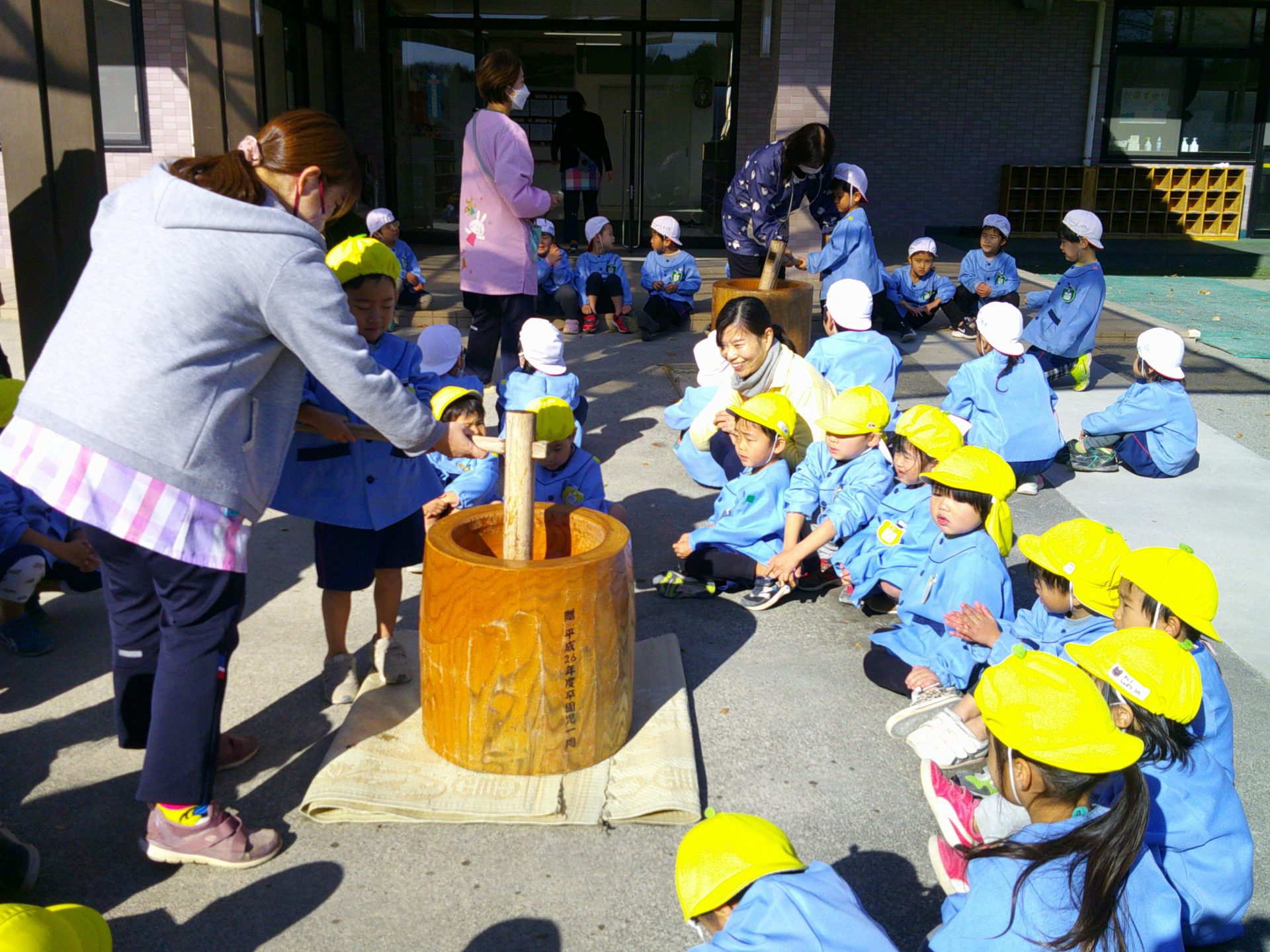 12月12日(金)、子どもたちは¨きね¨と¨うす¨を使って餅つきの体験をしました。餅米を蒸し、蒸しあがった米を機械づきにしているところを見学してから、餅つきを体験しました。