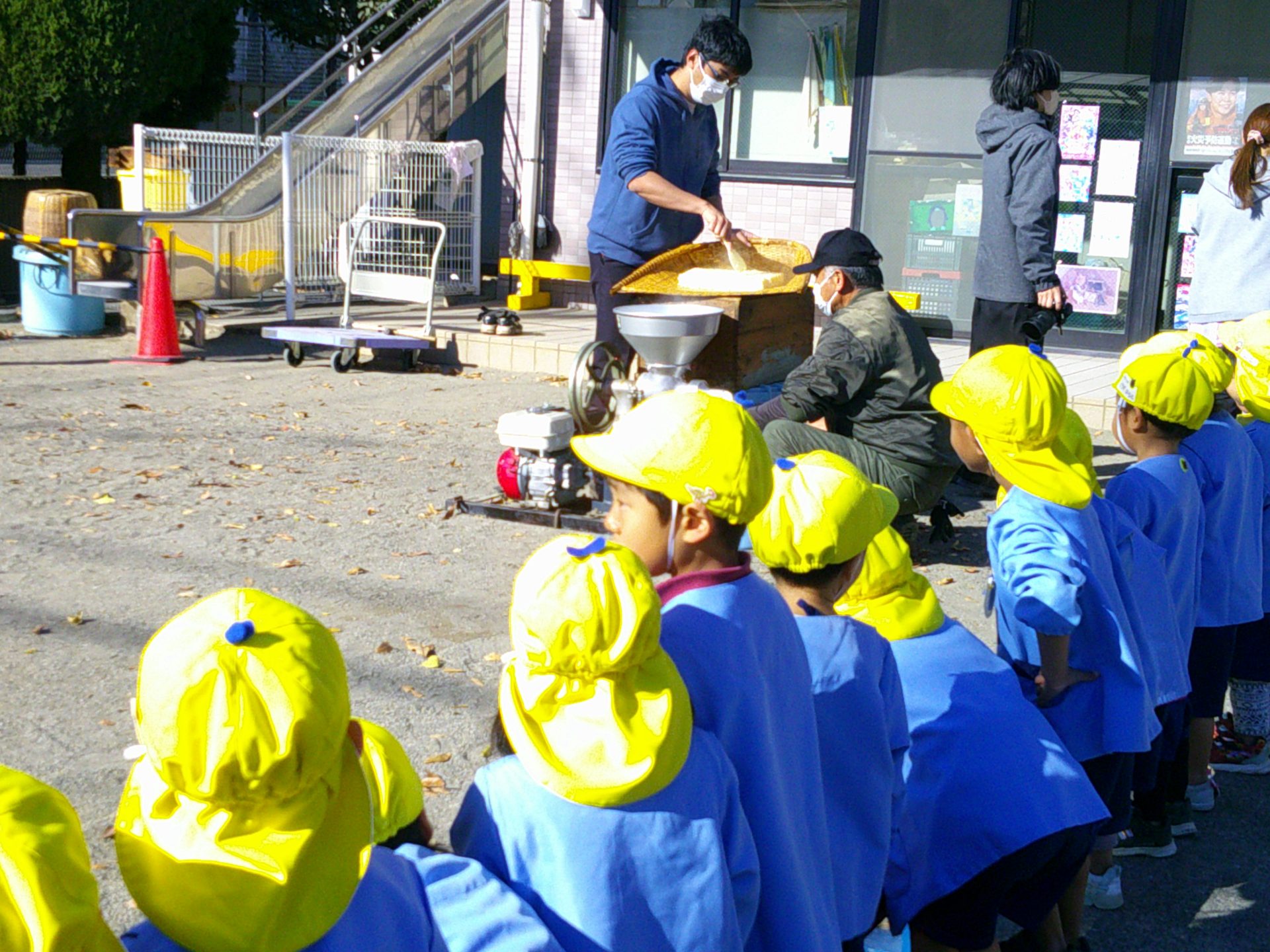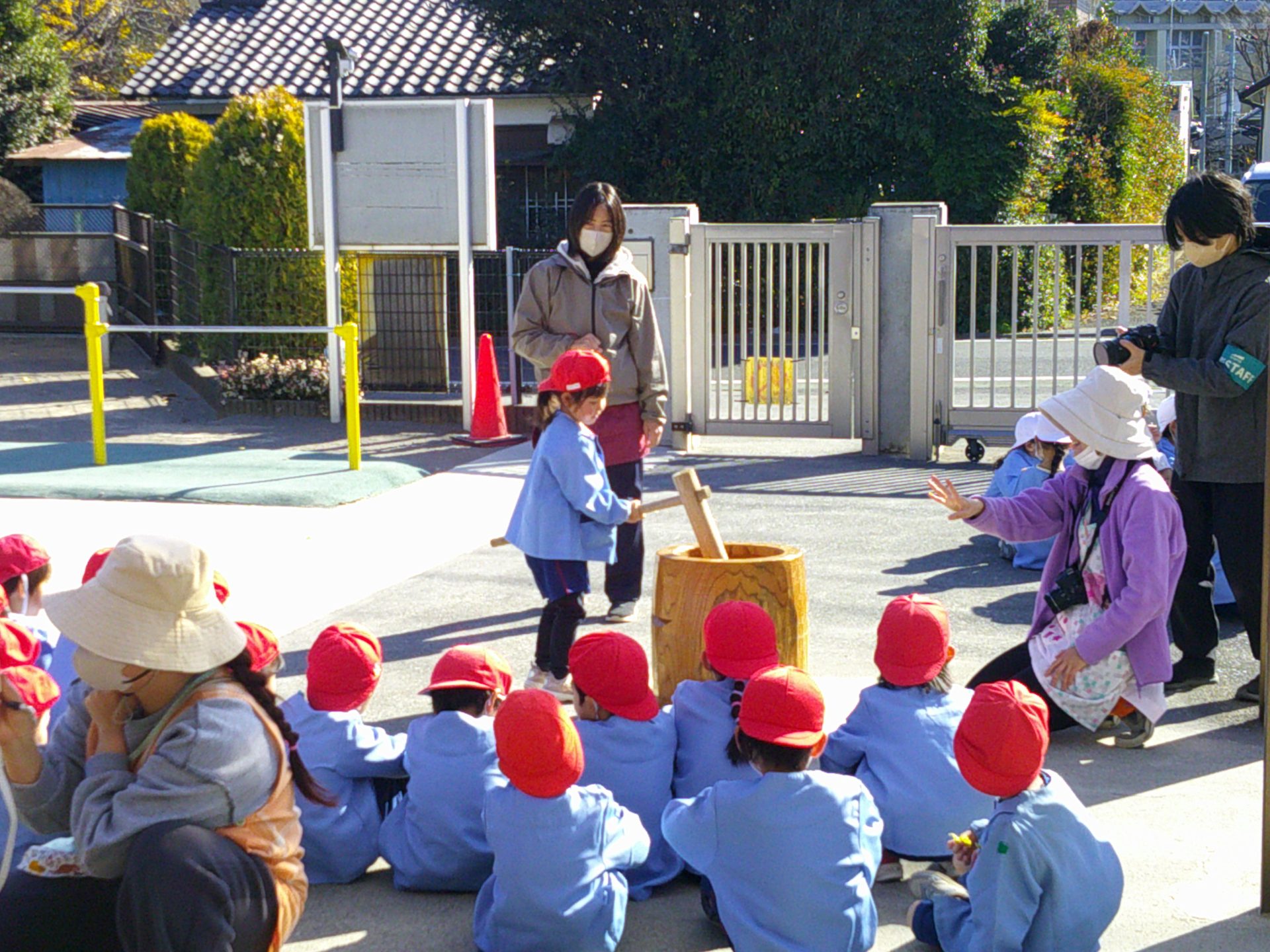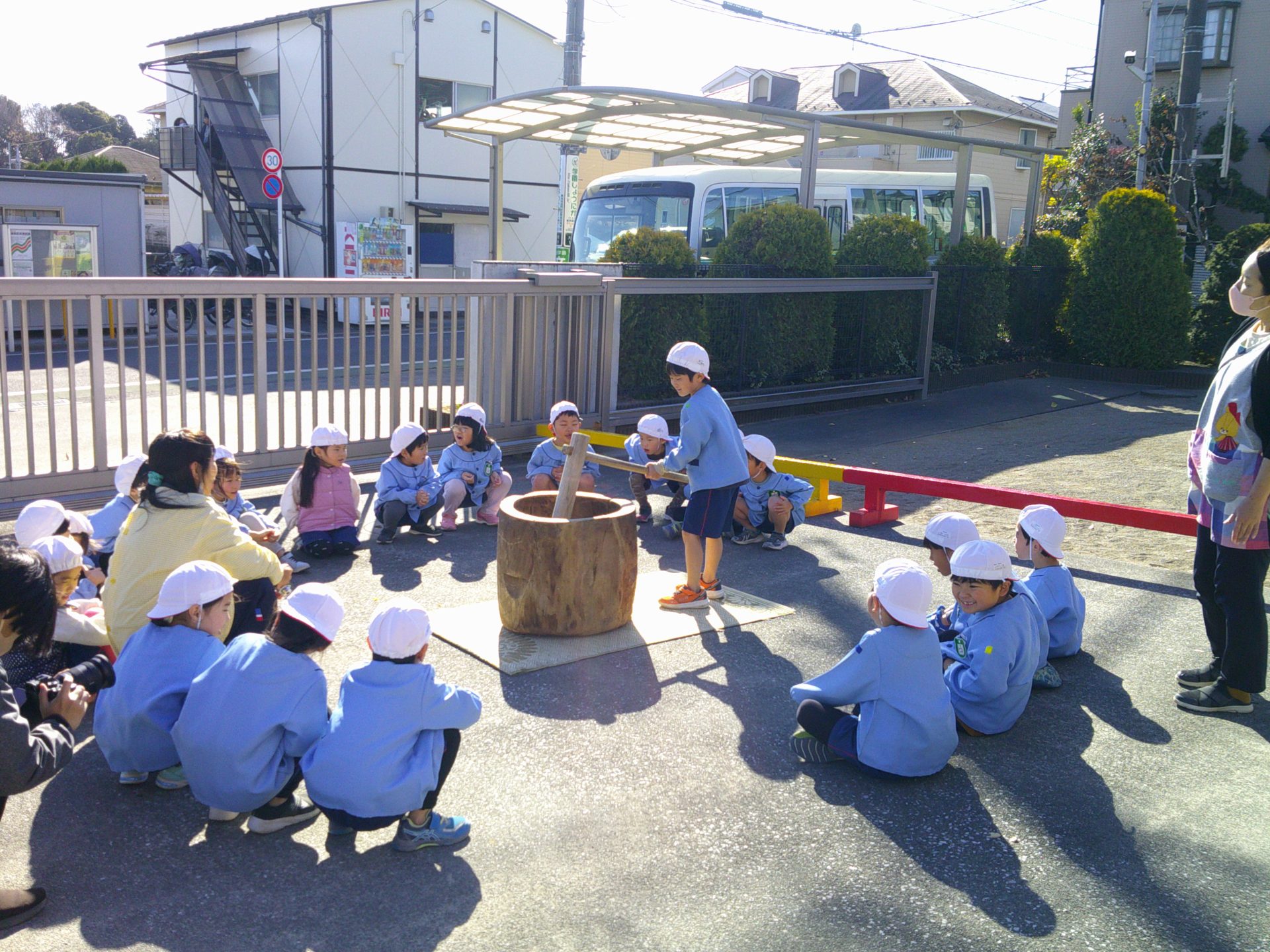 12月12日(金)、子どもたちは¨きね¨と¨うす¨を使って餅つきの体験をしました。餅米を蒸し、蒸しあがった米を機械づきにしているところを見学してから、餅つきを体験しました。